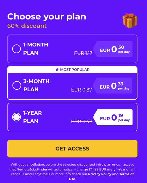 Based on the pricing screenshot provided, RemoteJobsFinder advertises discounted per-day pricing for different billing windows, such as a one-month plan, a three-month plan, and a one-year plan. The interface emphasizes low daily amounts to make the purchase feel small.